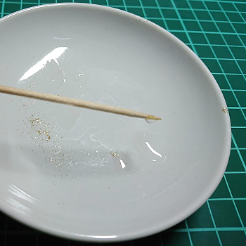 まずは皿的なものにジェルクリアと星の欠片を出し、爪楊枝ですくって目の上に置いていきます。塗るというよりはちょんちょんと置いてお好みの厚さに伸ばす感じです。