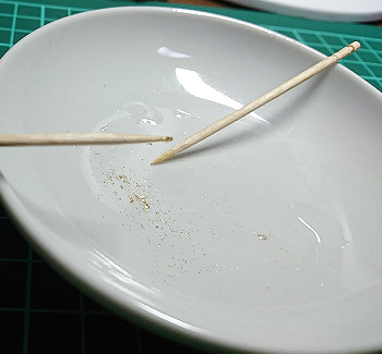 ペイントで気に入らない部分があればそこを隠し、逆にうまくいった部分やハイライトは隠さないように、爪楊枝の先でちょいちょいして調整します。