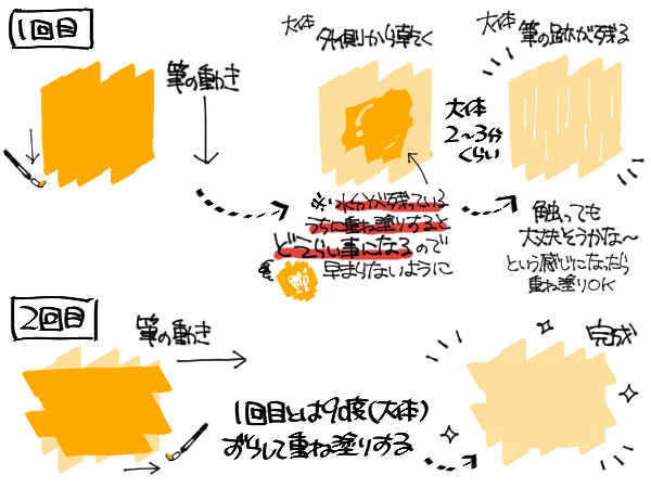 この1段階目の状態の間に、水分多めの同じ色を重ね塗りすることによって、筆ムラを溶かして消すことが出来るわけです。1回目に塗った方向とは直角に2回目を塗るとより綺麗に消えやすいです。