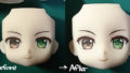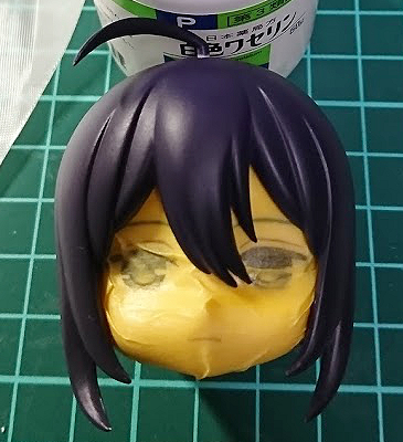 元はこんな感じでした(目の位置を確認するため、顔はリペイントしていない予備パーツをマスキングしています)。これにとりあえず2回盛って、