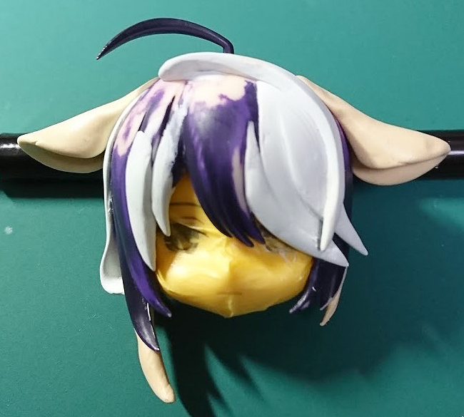 猫耳も本当は軸打ちするつもりだったのですが、面倒臭くなったため 耳の造形上一旦そのままくっつけました。ヤスリで滑らかにした後、耳の中がまだ空洞なので、根元にフワッと毛らしきものを埋め込みたいところ。作業途中でもげたら軸打ちする予定です。