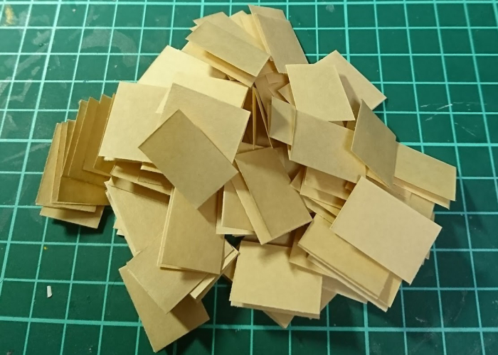 さて、昔買ったクラフト紙(B5)が余っていたため、これを丁度いいサイズになるまで半分にカットしていった結果、B12(16mm×23mm)が私には理想的なサイズでした。そんなわけで、1枚のB5用紙からB11サイズを64枚切り出し、すべて2つ折りにします。これを…